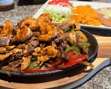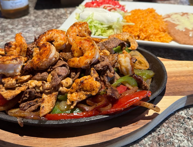 A sizzling combo of steak, chicken, and shrimp grilled with onions, bell peppers, and tomatoes. Served with rice, beans, lettuce, sour cream, tomato, and warm tortillas. A true Tex-Mex favorite.